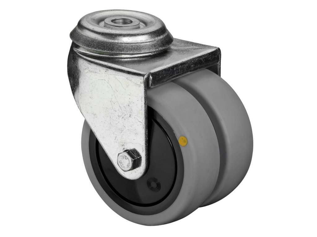 Apparatedoppelrolle B101.A89.075, Produkttyp: Lenkrollen, Befestigung: Rückenloch, Material/Art des Radkörpers: 0, Material der Lauffläche: thermoplastischer Gummi grau, elektrisch leitfähig, Lager: 0, Ø Rad: 75 mm, Tragkraft: 80 kgDodatočné parametre