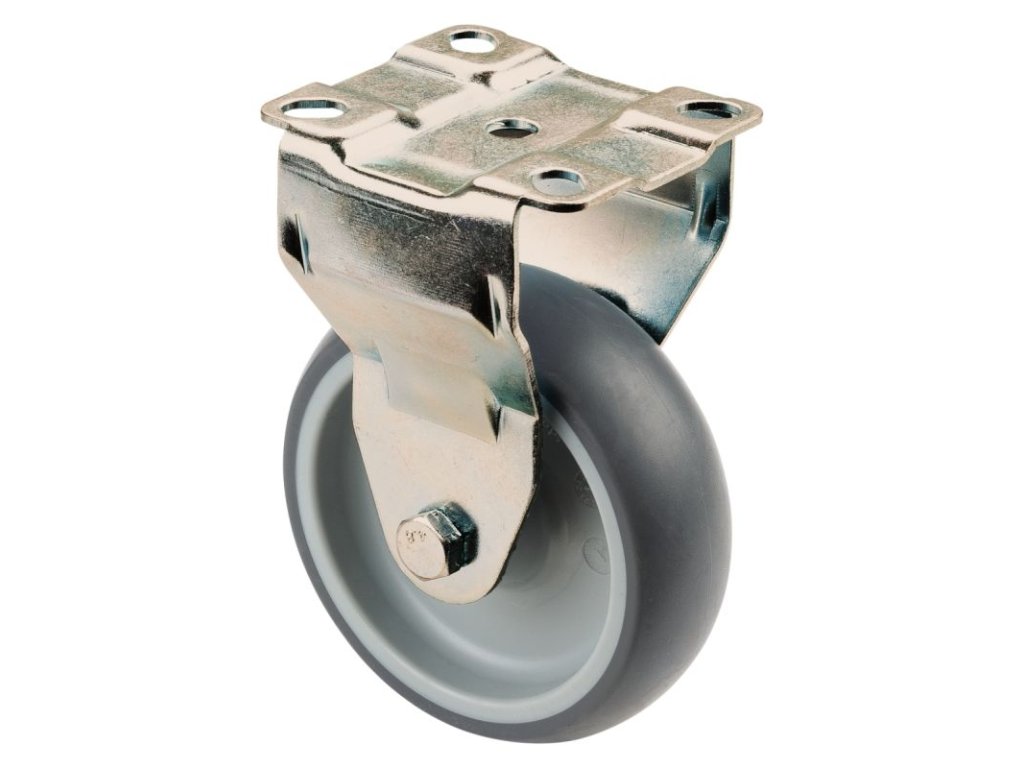 Polyamidový disk kolieska s klzným ložiskom, behúň šedá neznačkujúca guma, nerezová vidlica. Priemer kolieska 100mm, šírka behúňa 32mm, veľkosť prírubovej dosky 77x67mm, rozteč otvorov 61,5/56x51,5/46,5mm, veľkosť otvoru na uchytenie 8,5mm, stavebná výška 135mm, centrovanie 38mm, nosnosť 100kg.