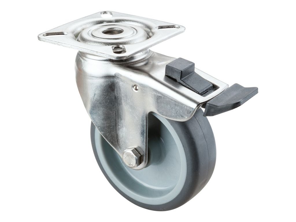 Polyamidový disk kolieska s klzným ložiskom, behúň šedá neznačkujúca guma, nerezová vidlica. Priemer kolieska 75mm, šírka behúňa 25mm, veľkosť prírubovej dosky 60x60mm, rozteč otvorov 48/38x48/38mm, veľkosť otvoru na uchytenie 6,2mm, stavebná výška 100mm, centrovanie 24,5mm, nosnosť 75kg.