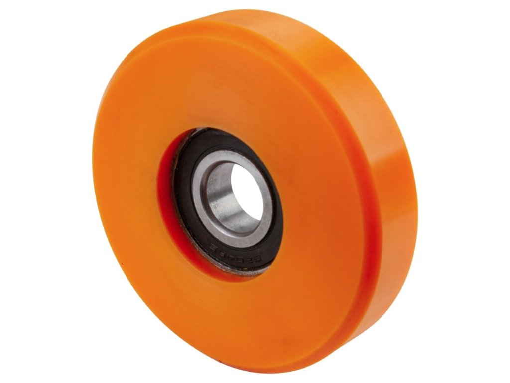 Polyuretánový neznačkujúci behúň, Shore A93 +/-3 s guličkovým ložiskom 6204-2RS. Priemer kolieska 100mm, šírka behúňa 25mm, dĺžka náboja 25mm, veľkosť otvoru na osku 20mm, nosnosť 140kg.