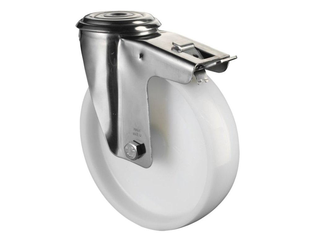 Edelstahl Transportrolle H121.A90.150, Produkttyp: Lenkrollen mit Feststeller, Befestigung: Rückenloch, Material/Art des Radkörpers: 0, Material der Lauffläche: Kunststoff, Lager: 0, Ø Rad: 150 mm, Tragkraft: 200 kgDodatočné parametre