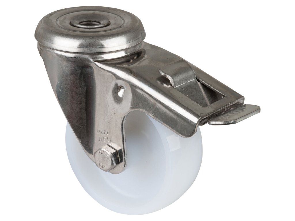 Edelstahl Transportrolle H121.A90.080, Produkttyp: Lenkrollen mit Feststeller, Befestigung: Rückenloch, Material/Art des Radkörpers: 0, Material der Lauffläche: Kunststoff, Lager: 0, Ø Rad: 80 mm, Tragkraft: 100 kgDodatočné parametre