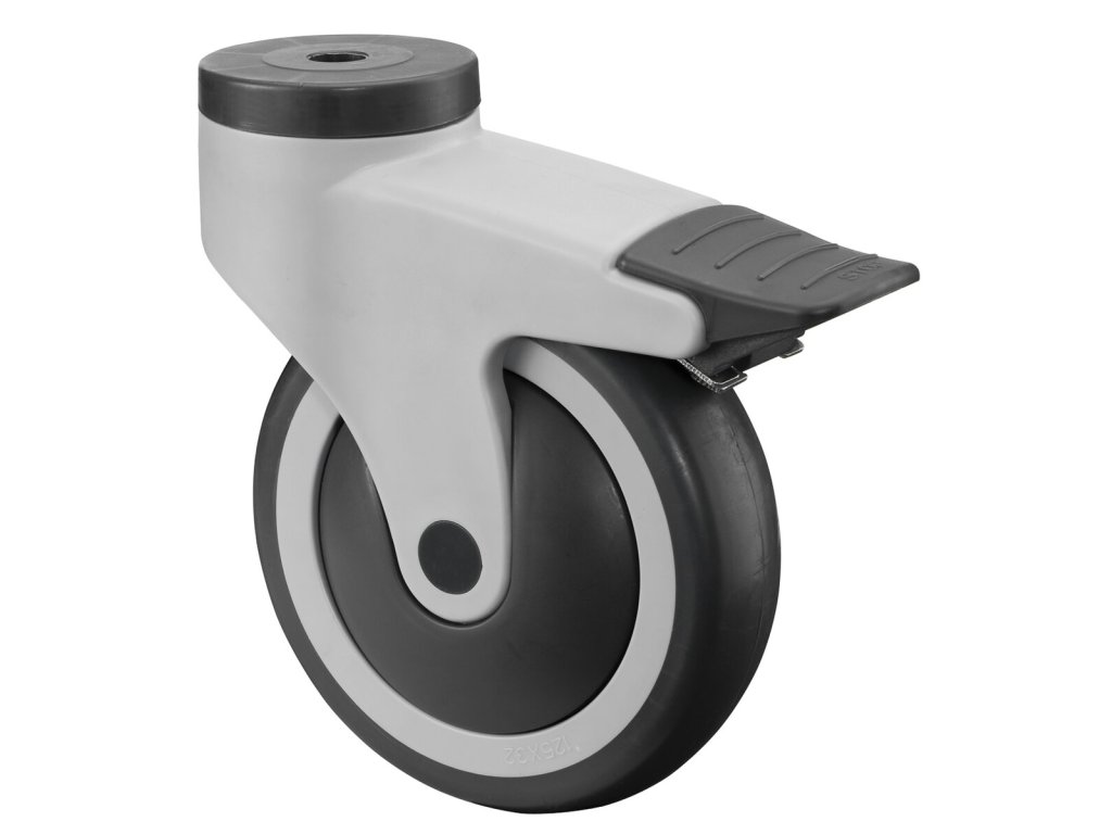 Kunststoffrolle C121.A82.125, Produkttyp: Lenkrollen mit Feststeller, Befestigung: Rückenloch, Material/Art des Radkörpers: 0, Material der Lauffläche: thermoplastischer Gummi grau, Lager: 0, Ø Rad: 125 mm, Tragkraft: 100 kgDodatočné parametre