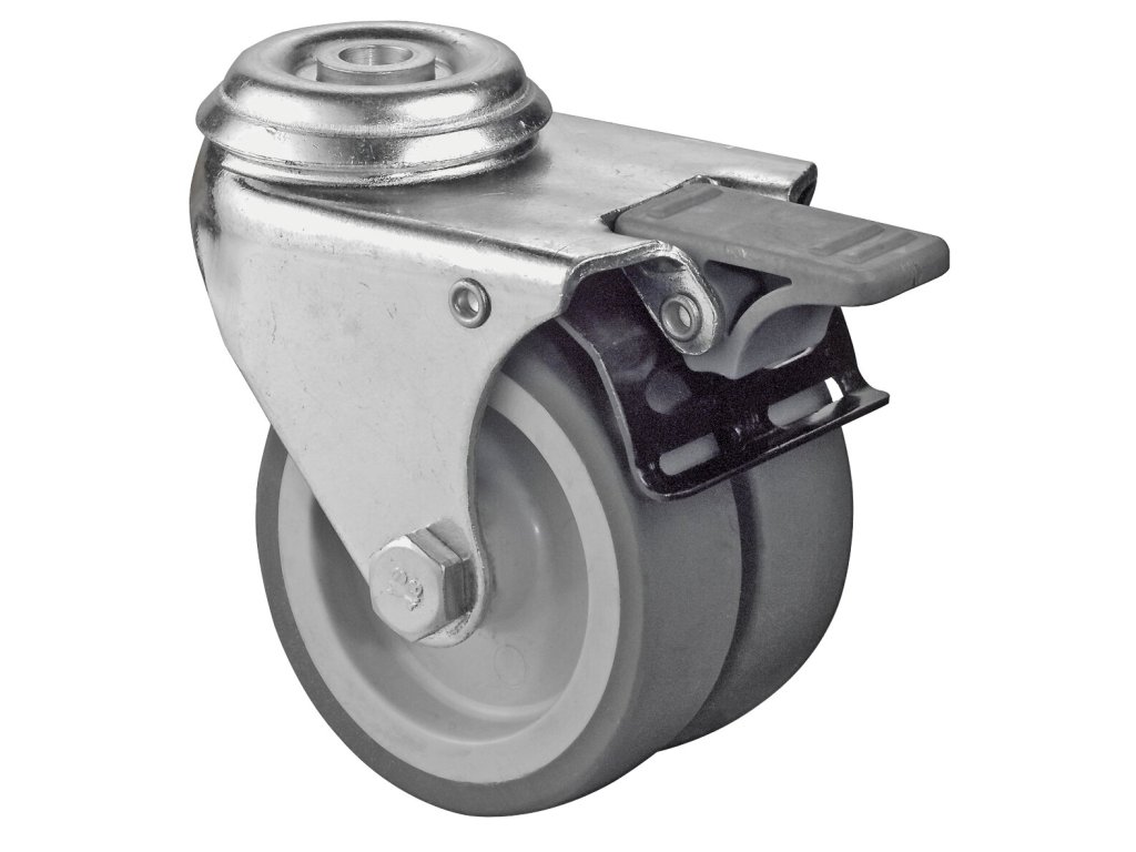 Apparatedoppelrolle B121.A80.075, Produkttyp: Lenkrollen mit Feststeller, Befestigung: Rückenloch, Material/Art des Radkörpers: 0, Material der Lauffläche: thermoplastischer Gummi grau, Lager: 0, Ø Rad: 75 mm, Tragkraft: 80 kgDodatočné parametre