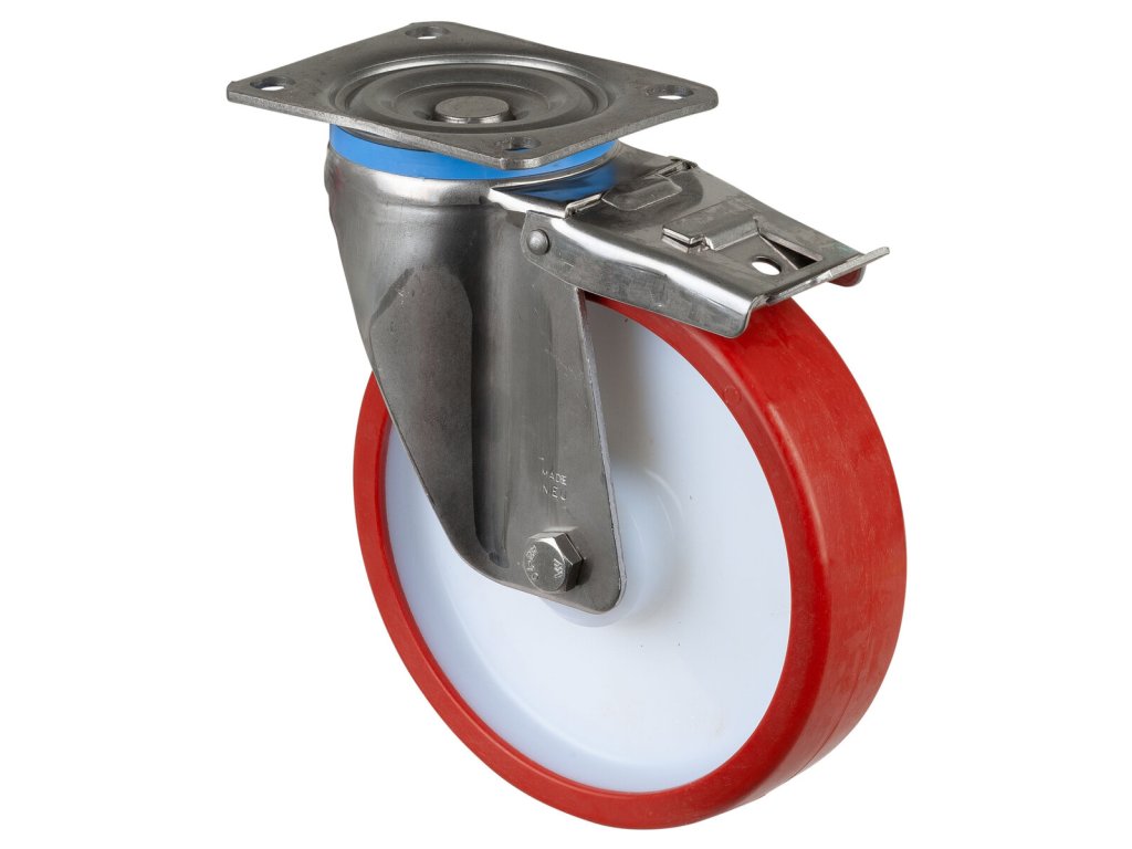 Edelstahl Schwerlastrollen HS120.B28.201, Produkttyp: Lenkrollen mit Totalfeststeller, Befestigung: Zapfenbefestigung, Ø Schraubloch: 105x80 mm, Material/Art des Radkörpers: 12, Material der Lauffläche: Polyurethan rot 98 +/-4 Shore A, Lager: 0, Ø Rad: 200 mm, Tragkraft: 450 kgDodatočné parametre