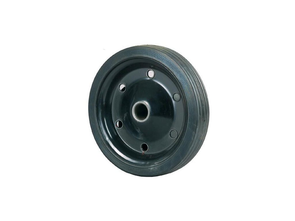 Oceľový disk kolieska s klzným uložením, behúň plná čierna guma. Priemer kolieska 180mm, šírka behúňa 48mm, dĺžka náboja 45mm, veľkosť otvoru na osku 20mm, nosnosť 100kg.