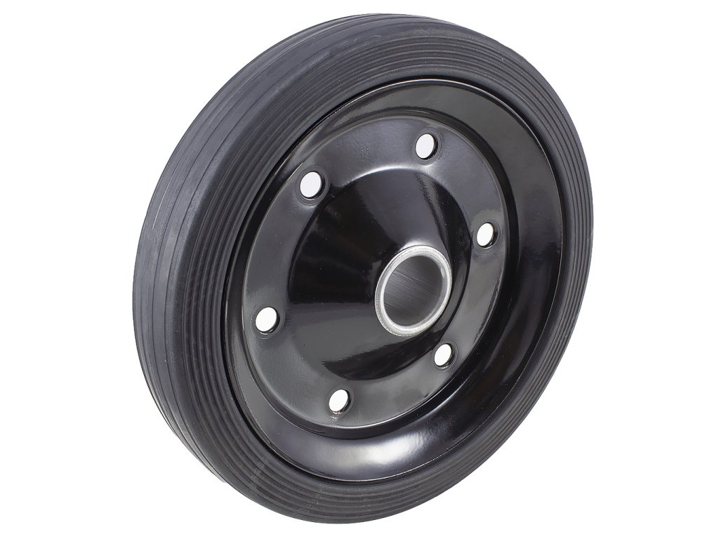 Oceľový disk kolieska s klzným uložením, behúň plná čierna guma. Priemer kolieska 250mm, šírka behúňa 52mm, dĺžka náboja 52mm, veľkosť otvoru na osku 20mm, nosnosť 100kg.Dodatočné parametre